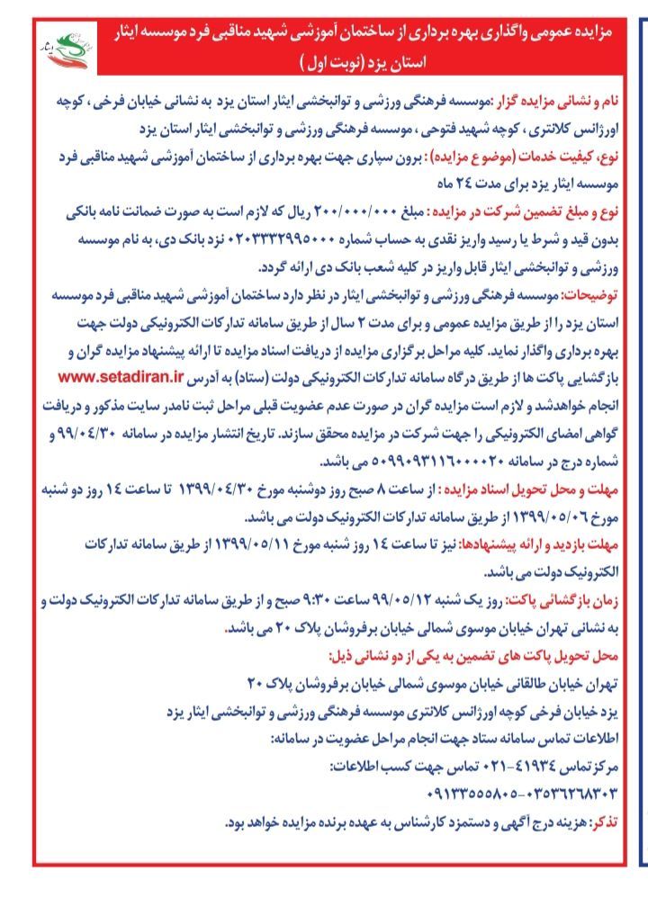 مزایده ساختمان اقامتی موسسه ایثار یزد